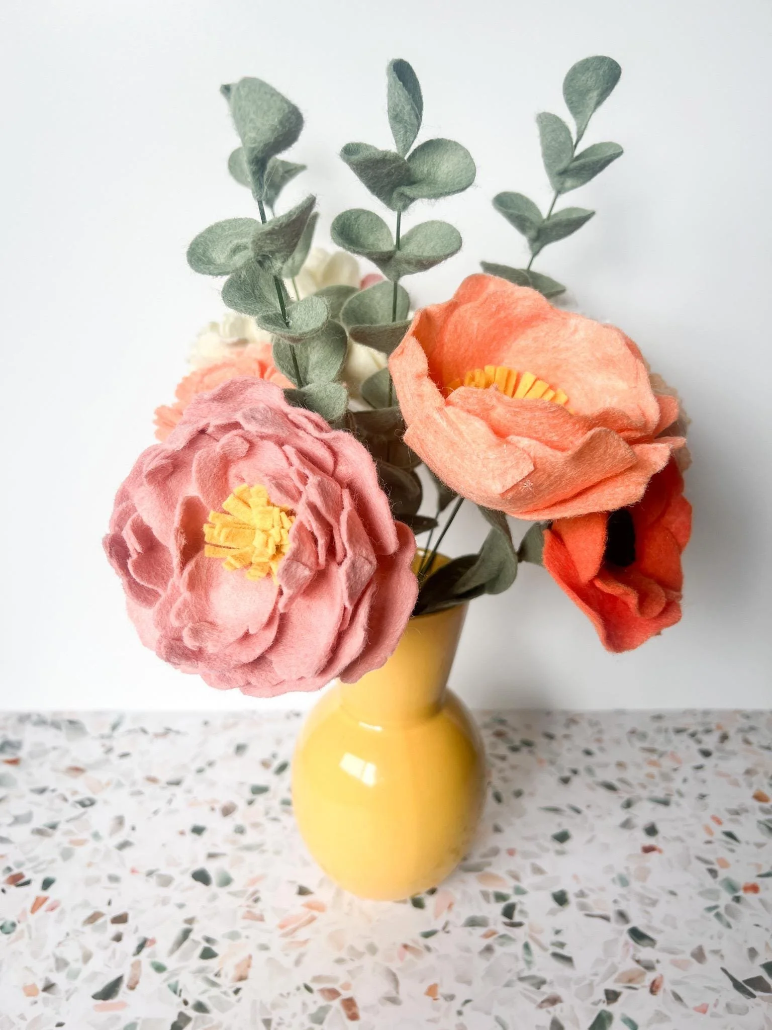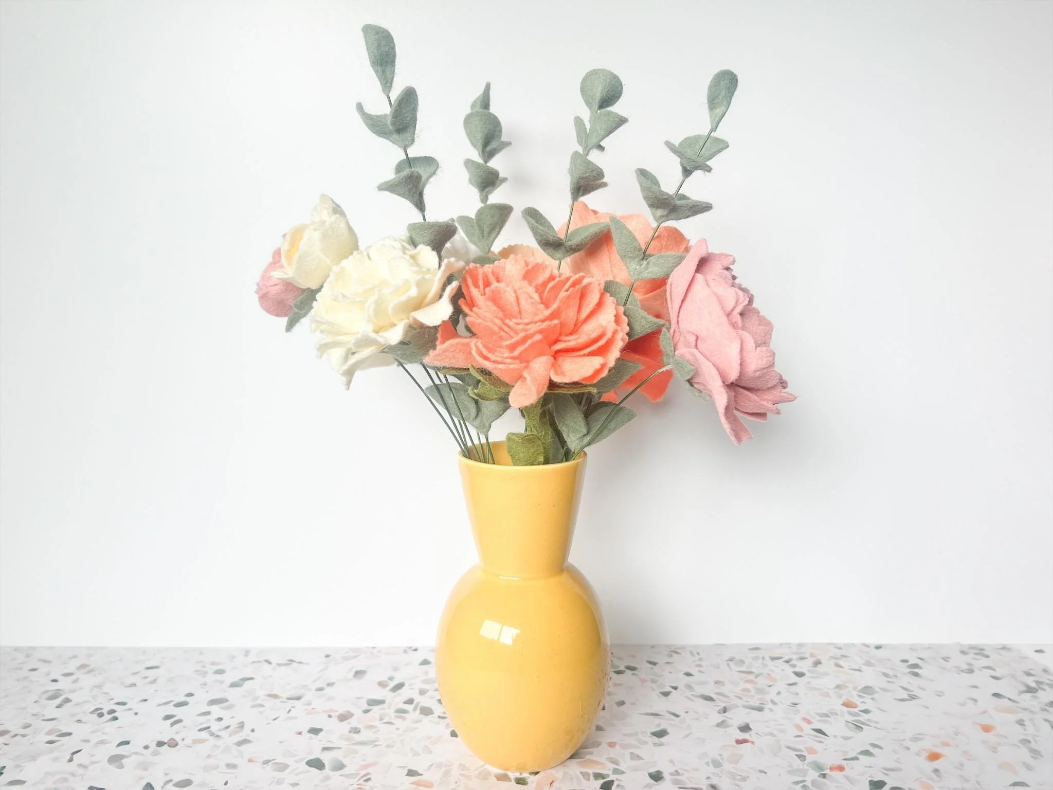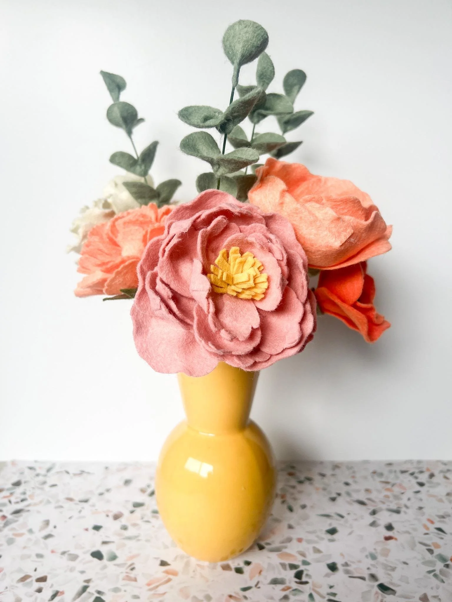 Bring a touch of everlasting beauty to your home with this meticulously handcrafted felt flower bouquet. Featuring lush coral and blush peonies, accented by soft peach blooms and lifelike eucalyptus stems, this arrangement adds warmth and charm to any space—no watering required.