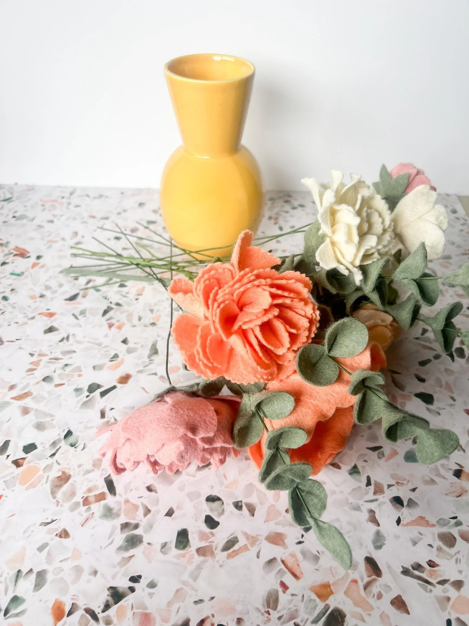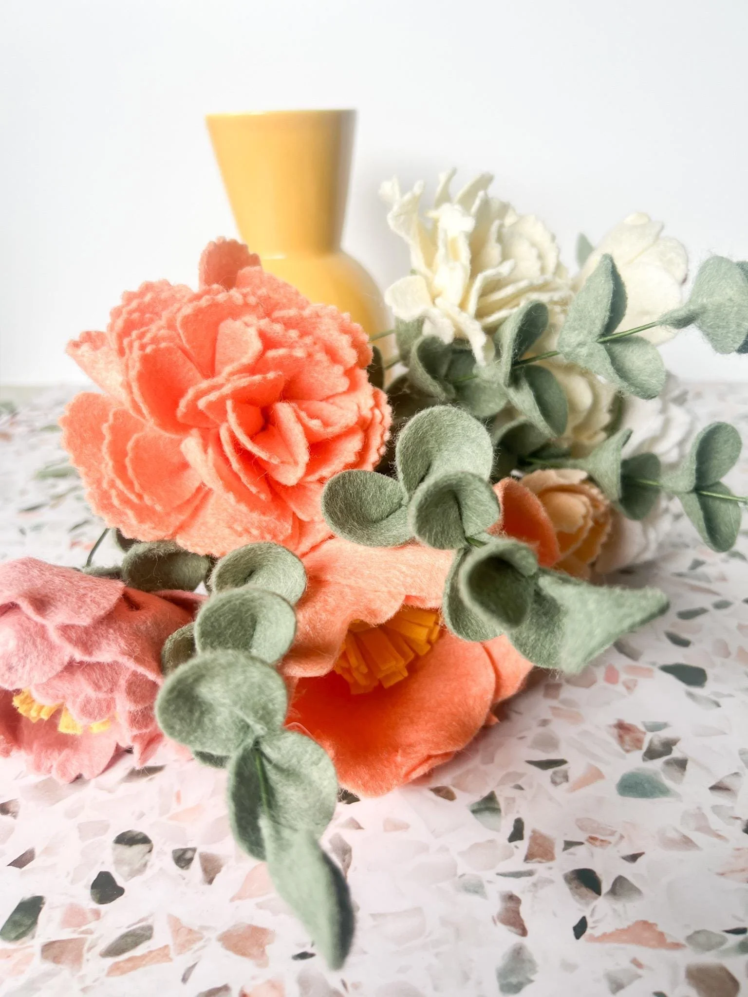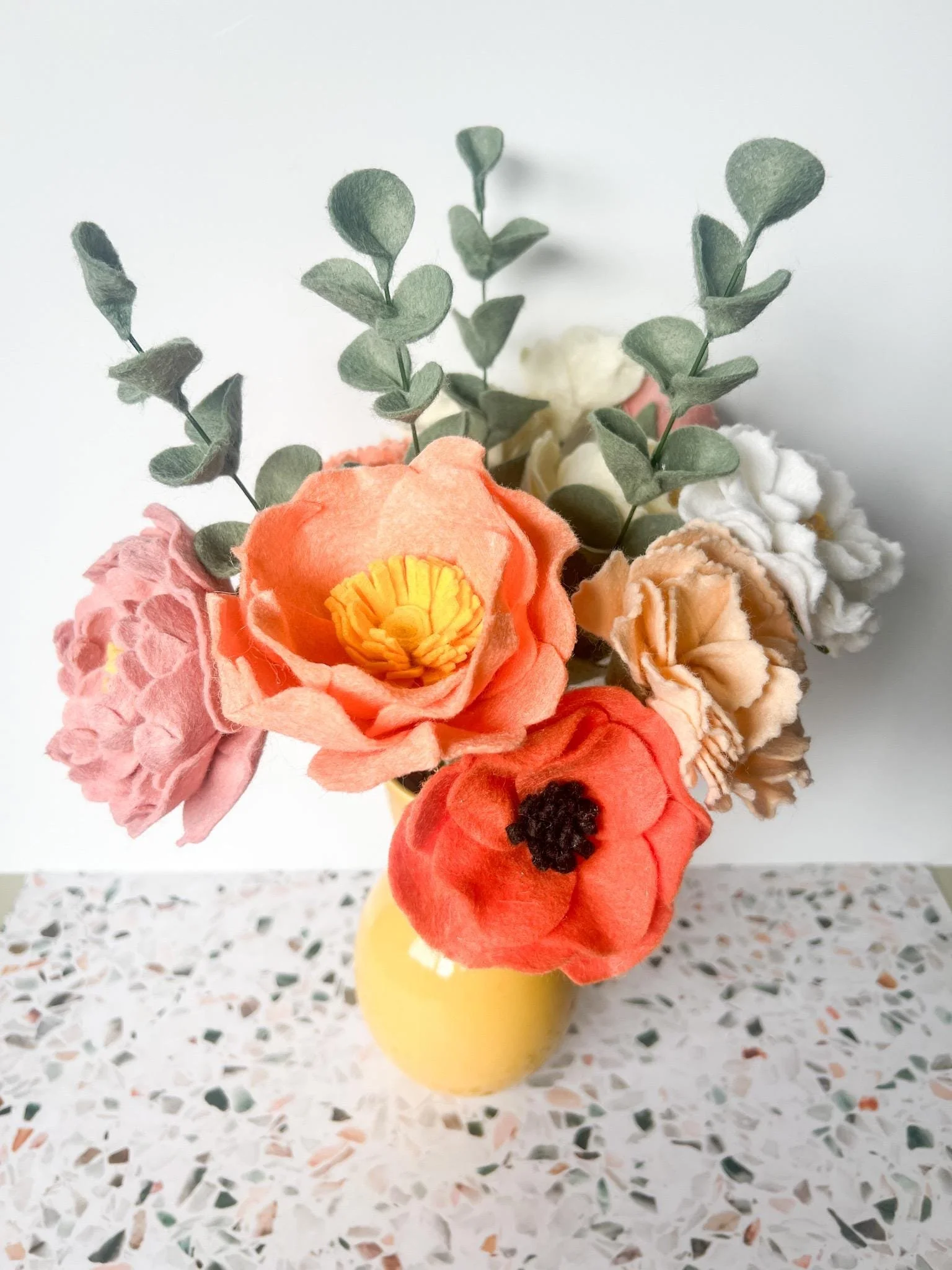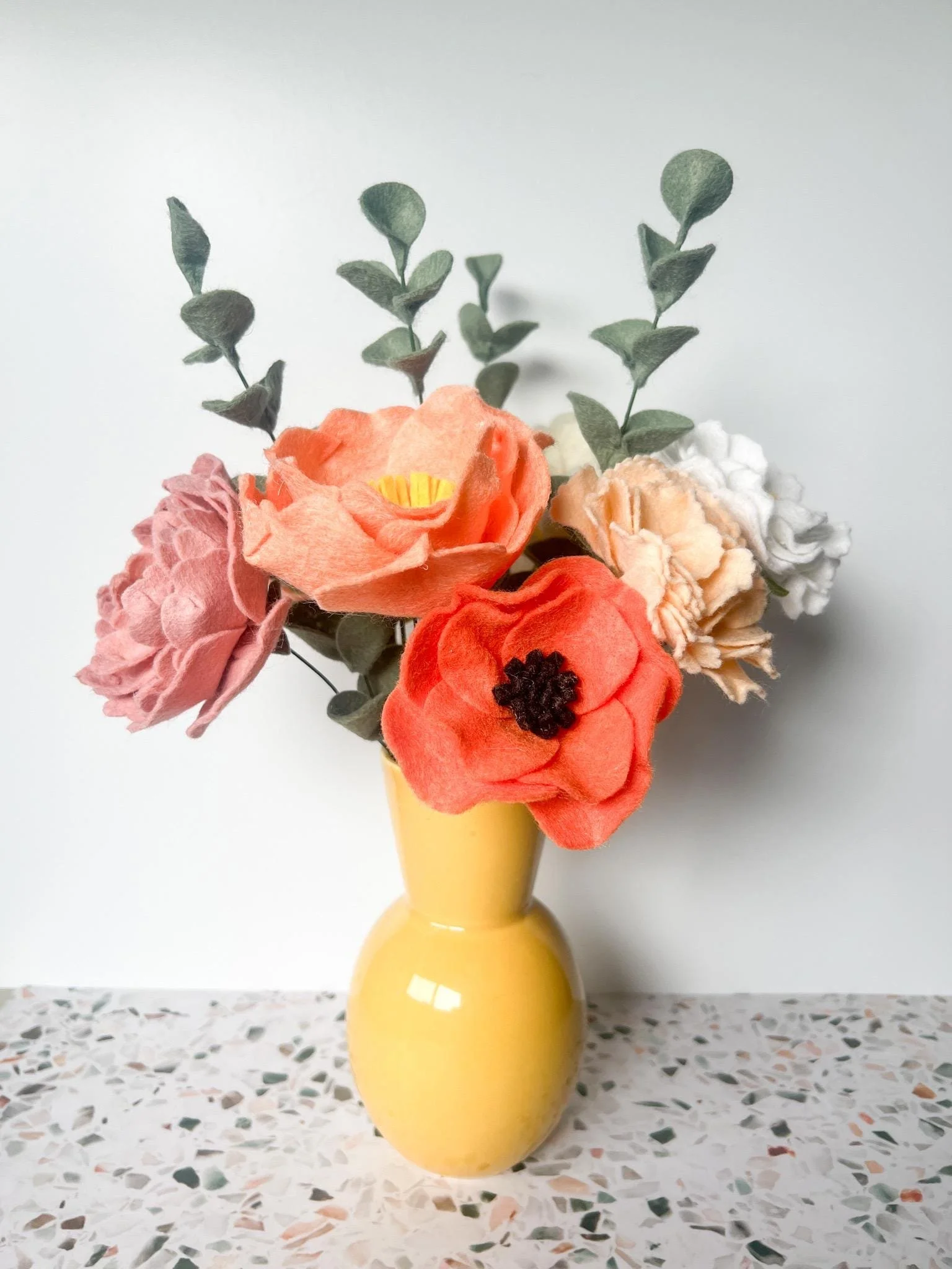 Bring a touch of everlasting beauty to your home with this meticulously handcrafted felt flower bouquet. Featuring lush coral and blush peonies, accented by soft peach blooms and lifelike eucalyptus stems, this arrangement adds warmth and charm to any space—no watering required.