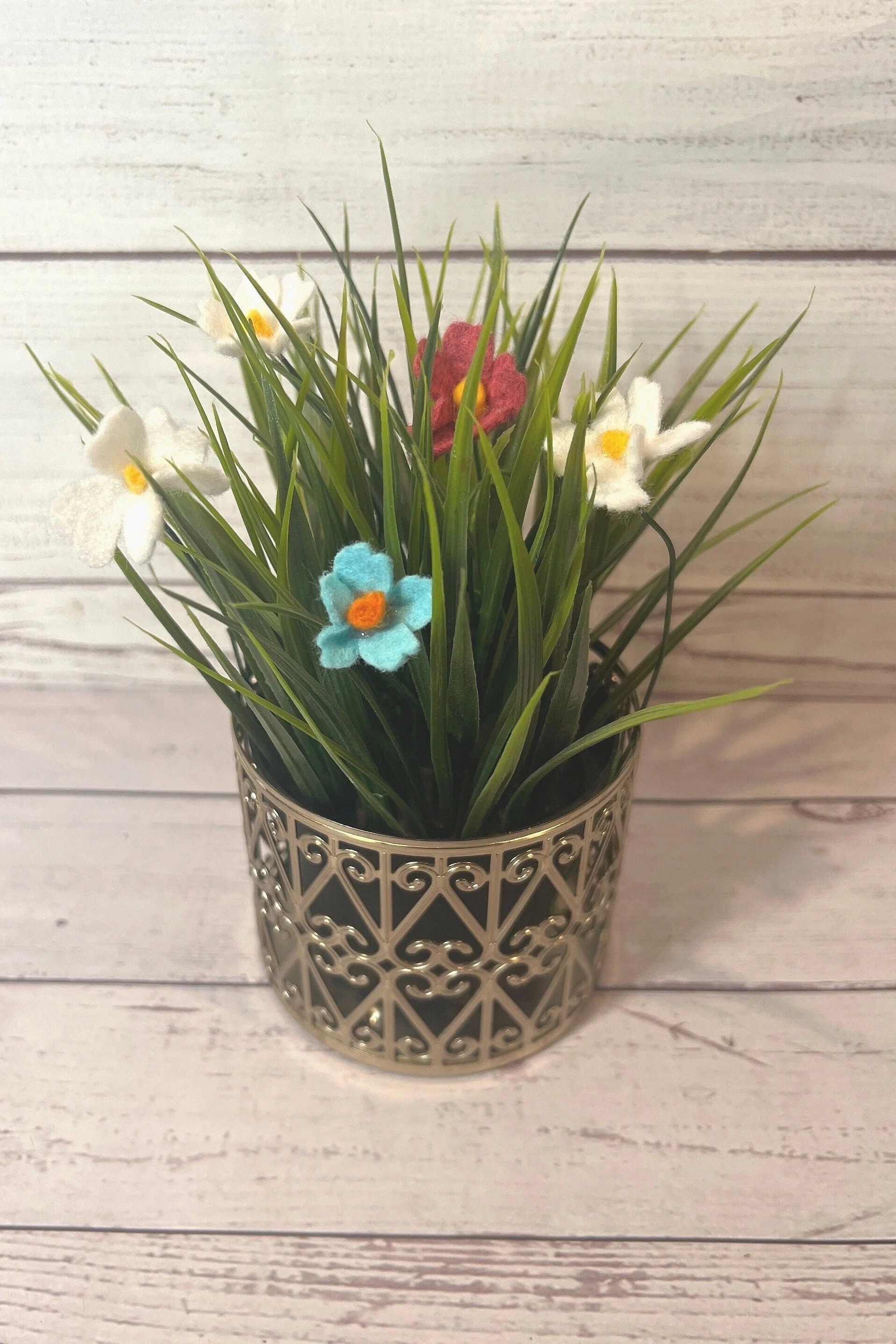 💐 Flowers are an investment; investing in flowers that will last forever is a no-brainer. Say goodbye to wilting, changing water, slimey stems, fruit flies, and keeping your flowers away from your pets.Hello and welcome to my felt and paper flower shop! I am pleased to have you here and I thank you for looking! First photo shows flowers bent down shorter and placed in a faux grass plant. The other photos show different mixes you may receive; if you want something specific, please message me!