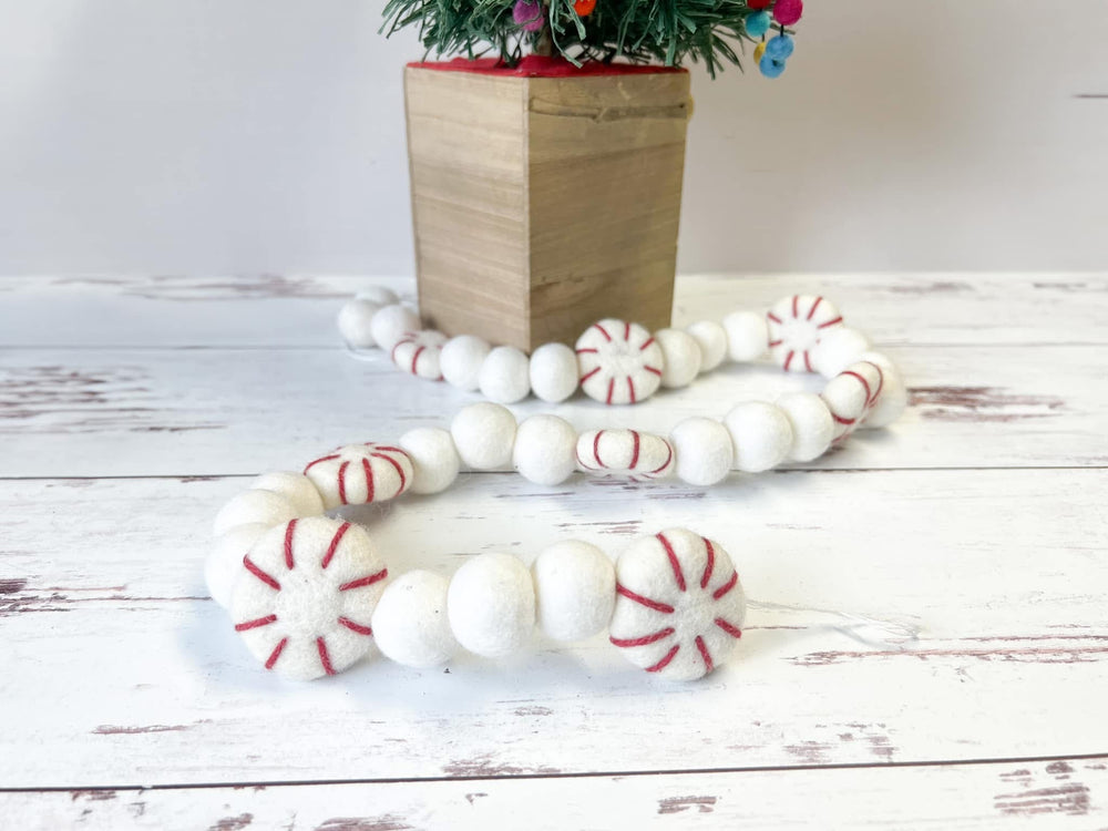 Add a touch of sweet holiday charm with this handcrafted peppermint felt ball garland, made from 100% wool felt. Each strand combines soft white felt balls and peppermint-inspired accents stitched in festive red — perfect for your mantel, tree, or holiday table.